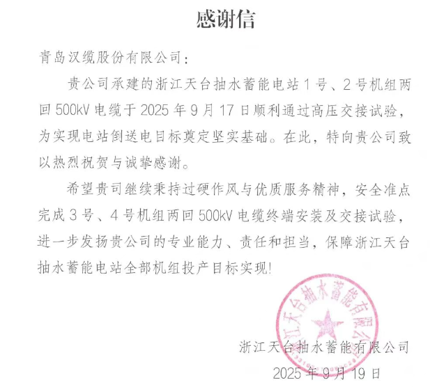 值得一提的是,憑借在電纜設(shè)計(jì)聯(lián)絡(luò)、設(shè)備制造到現(xiàn)場(chǎng)安裝等方面的出色表現(xiàn),漢纜股份收到業(yè)主單位——浙江天臺(tái)抽水蓄能有限公司發(fā)來的感謝信。信中對(duì)漢纜股份為1#、2#機(jī)組兩回500kV電纜及附件順利通過竣工試驗(yàn)所提供的專業(yè)技術(shù)支持和高效服務(wù)表示充分肯定。